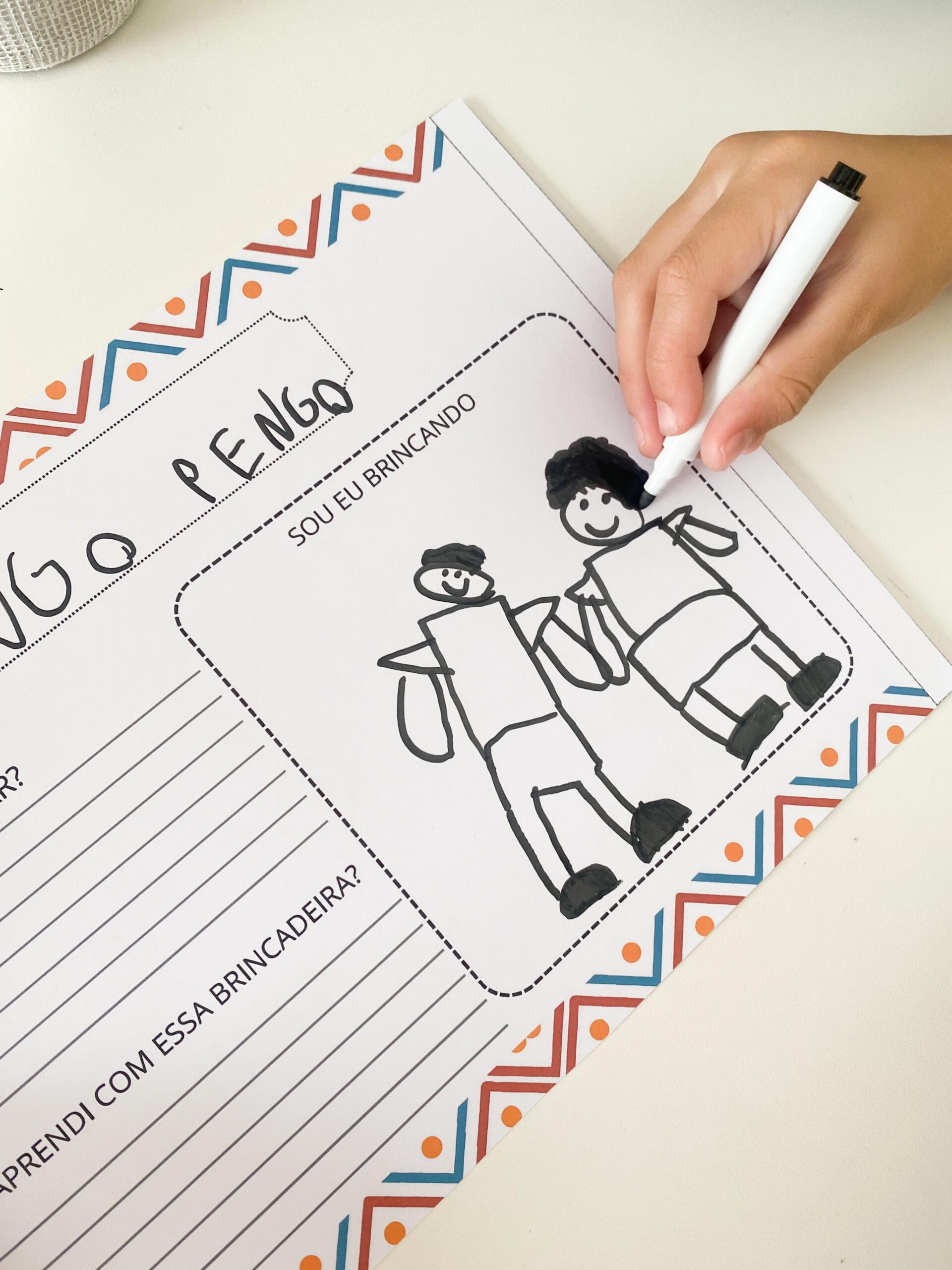 Depois da vivência, cada criança registra sua experiência escolhendo sua brincadeira favorita, desenhando uma pista na capa e, ao abrir o papel, desenha ela mesma brincando, respondendo também:
