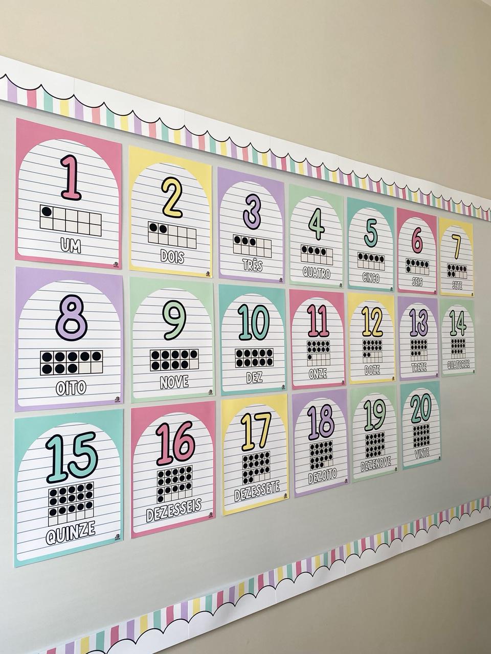 O painel numérico de 1 a 20 foi pensado para ficar no alcance das crianças, apoiando a contagem, a leitura dos numerais, a associação quantidade–número e a ampliação do repertório matemático no dia a dia da sala.