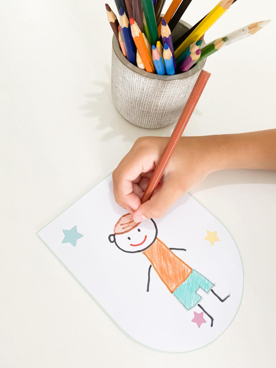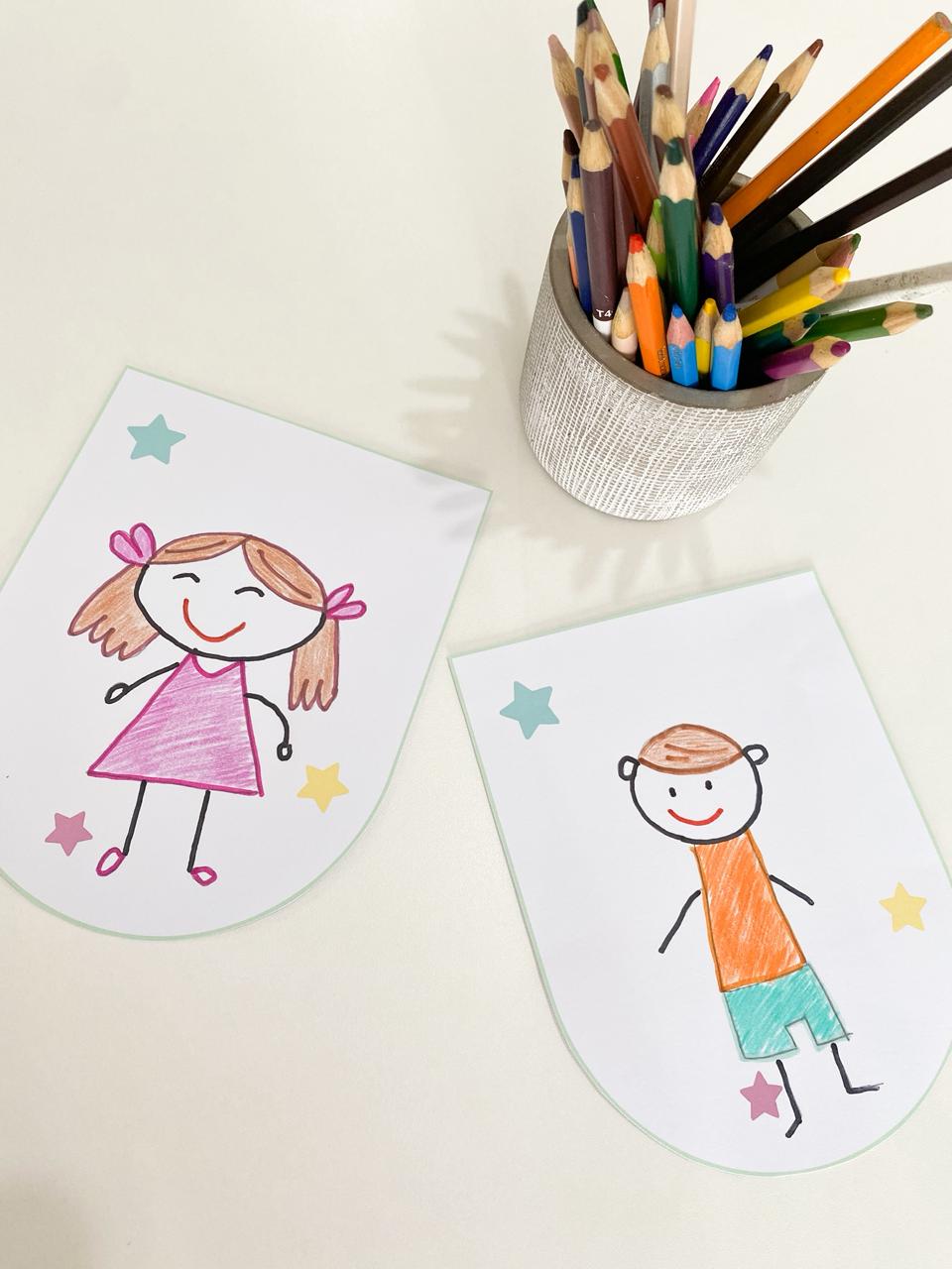 As crianças desenham seus autorretratos e passam a fazer parte da decoração da sala, fortalecendo o sentimento de pertencimento e identidade.